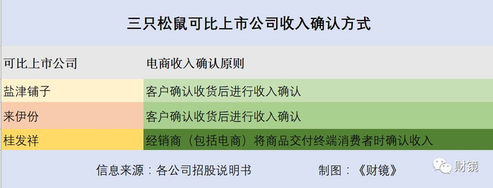另一方面,三只松鼠的收入确认方式也受到了质疑。《财镜》(微信id:news_cj)记者注意到,三只松鼠并没有采用电商常用的用户收货确认收入。在招股书中,三只松鼠明确表明,该公司线上、线下收入确认原则为发货后四天确认收入。