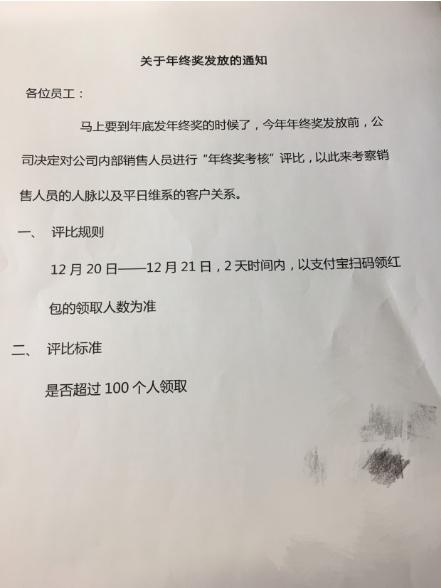 某中介公司的员工这两天爆料,公司老板在发年终奖前要求所有在职销售员工进行奇葩年终奖考核: 2天的时间内找到100个人领到他们个人的支付宝扫码红包才算考核过关,否则不能拿到全额年终奖金。