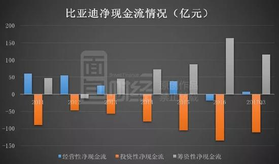 近年来,比亚迪的经营性净现金流波动很大,在2016年甚至为负18.46亿元。同时,其投资性净现金流一直为巨额净流出,常年保持在50亿元以上,2015年开始飙升至100亿以上。