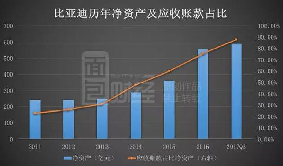 比亚迪第三季度末的应收账款,从2011年的51.34亿元增长到2017年的516.77亿元,增长了9.07倍,同期营业收入从343.34亿元增长到739.33亿元,只增长了1.15倍。