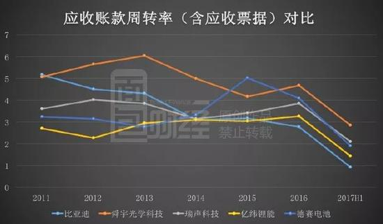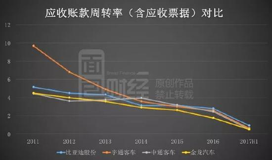 按照上图的口径:比亚迪的应收账款周转率(包括应收票据)从2011年的5.16次骤降至2016年的2.77次,降幅明显。
