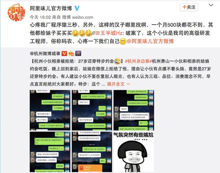 今天(1月8日)下午,认证为阿里巴巴官方文化账号的@阿里味儿官方微博 表示,这个被拒绝的小伙是阿里巴巴的高级研发工程师。