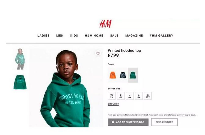 这则平面广告的照片显示的是一名黑人儿童身着H&M一款绿色卫衣,衣服上写着“森林里最酷的猴子”字样。与此形成对比的是,白人儿童模特所穿着的卫衣是印有“生存专家”的款式。这则广告很快在国外社交媒体上激起了网友愤怒,不少网友认为这则广告涉嫌种族歧视,最起码说明H&M对种族问题缺乏敏感性。Twitter也对这则广告进行了抨击,促使H&M做出回应致歉,并将连帽衫从其产品中撤销。