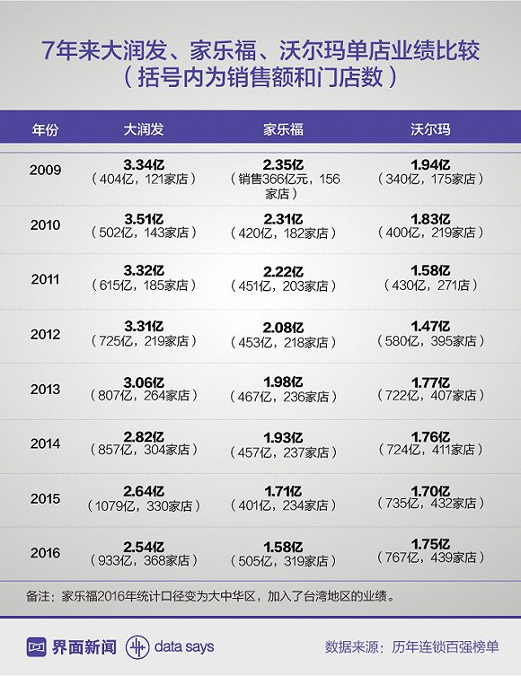 2012年后,家乐福中国业绩和利润,开始进入到双下滑的阶段。 到了2016年,家乐福的单店业绩从2009年的2.35亿元滑落至2016年的1.58亿元。而大润发和沃尔玛的单店业绩分别为2.54亿元和1.75亿元。