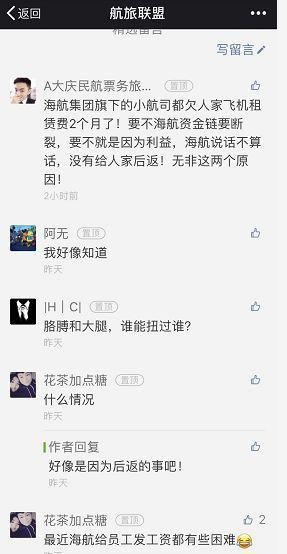 该文章发出后引发业内哗然。在该文章的留言区,有人爆料保盛停售海航机票是因为海航不给返点,而海航旗下的航空公司已经拖欠飞机租赁费两个月。还有人称,最近海航给员工发工资都有些困难。