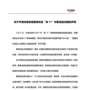 2月7日,中消协发布2017年“双11”网络购物调查体验情况报告,称聚美优品平台“双11”期间销售的“雅诗兰黛特润修护肌透精华露50ml装”,“根据商标权益人或授权人的鉴定结果”存在问题。