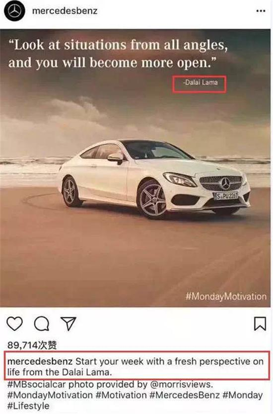 北京时间2月5日深夜,在国际社交网站Instagram上,奔驰官方账号更新了一条状态——一张奔驰C级Coupe车型的图片,图片上方写着“Look at situations from all angles,and you will become more open.”这句话大概意思是“多从不同角度看待问题,你的视野会更加宽广。”说实话,这句话本身没毛病,但奔驰还把这句话的原作者Dalai Lama的名字给标上了,甚至还配上了这样一段描述:新的一周从分享Dalai Lama对生活的新观点开始。