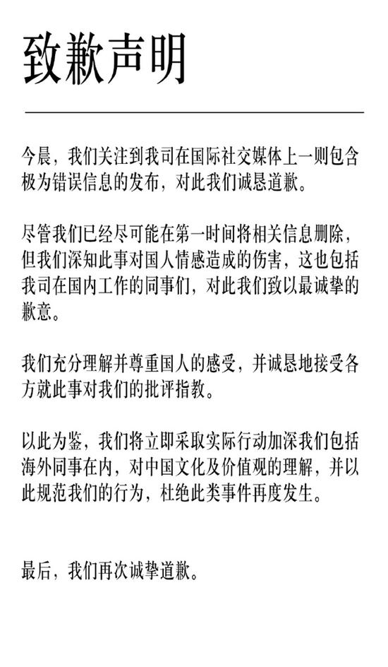 该事件升温后,奔驰也意识到激起了民愤,迅速删除该条状态,奔驰中国亦在新浪微博上发布道歉声明,但该图片的始作俑者——奔驰总部还未发布任何声明,也就是说这个锅直接甩给了奔驰中国处理。事实上,奔驰总部也确实不好说什么,一头是全球最大的单一市场中国,另一头是自己身处的西方世界,说什么都会招风。