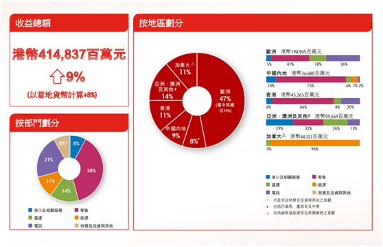 本次长和系业绩增长稳健。长和去年业绩收益总额为4148亿港元,同比增9%;普通股股东应佔溢利为351亿港元,同比增6%。每股盈利9.1港元。