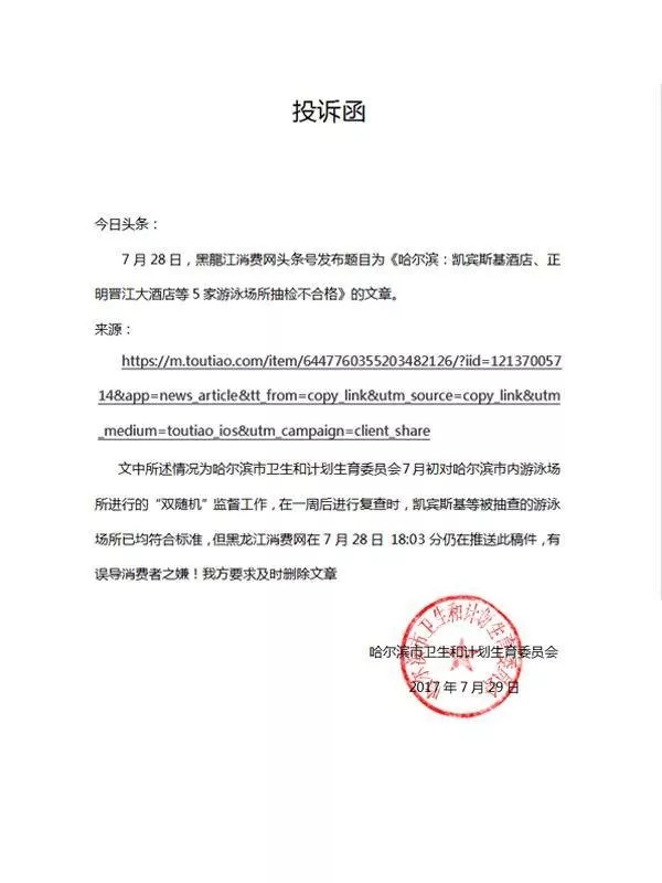 这到底是怎么回事?与今日头条北京总部工作人员联系后,给出的回答让小编也觉得意外:今日头条收到了哈尔滨市卫生和计划生育委员会的“投诉函”,投诉要求删除文章。随后发来一份蹊跷的“投诉函”图片。