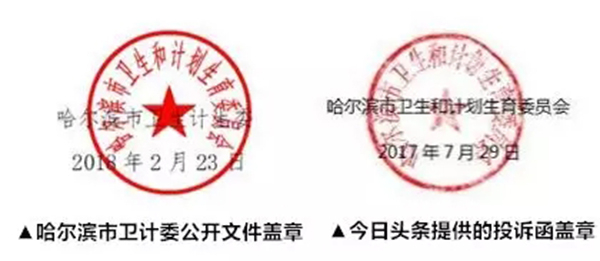 今日头条传过来的这份“投诉函”,上面盖着哈尔滨市卫生和计划生育委员会的红章,意思是哈尔滨市卫计委向今日头条投诉,让删除上面头条号上的报道稿件。