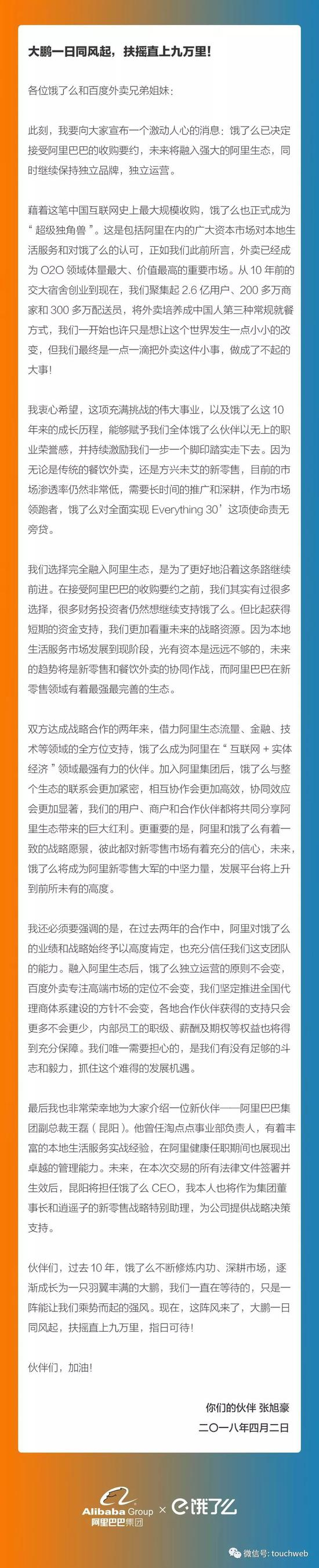 “更重要的是,阿里和饿了么有着一致的战略愿景,彼此都对新零售市场有着坚定的信心,加入阿里生态,饿了么的发展平台将上升到前所未有的高度。”