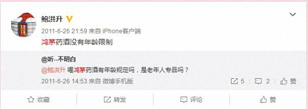 而鲍洪升本人在微博对鸿茅药酒的吆喝也相当用力。2011年6月26日,鲍洪升在微博回答网友关于喝鸿茅药酒是否有年龄规定的提问时表示,“鸿茅药酒没有年龄限制”,而鸿茅药酒药品说明书中则明确写明“儿童、孕妇禁用”。2011年6月15日,鲍洪升再次回答网友关于每天喝多少鸿茅药酒合适的提问表示,“每天喝三两正好,决对(应为绝对)不上火,放心吧。”而根据鸿茅药酒产品说明书规定,该药品每次服用15毫升,一日2次,即意味着每天最多服用30毫升,即半两左右。2012年2月9日,鲍洪升转发了网友声称“老人坚持每天喝点鸿茅药酒非常好,喝了酒就不用吃药了”的评论,并跟评称“我们的良心药”。