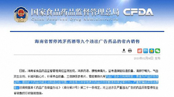 仅仅在国家食品药品监督管理总局官网上,以“鸿茅药酒”为关键词搜索,就可查询到海南省、云南省、湖南省、陕西省、北京市相继对鸿茅药酒违法药品广告做出过惩处措施。