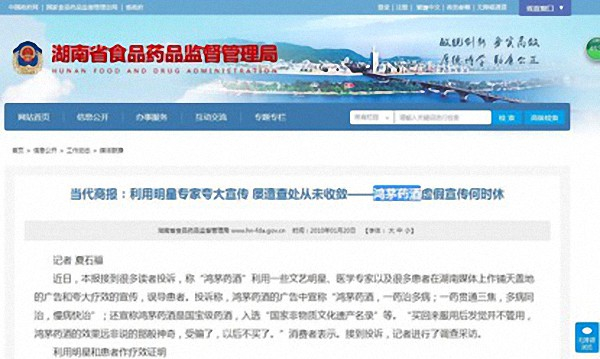 湖南省食药监官网《利用明星专家夸大宣传 屡遭查处从未收敛——鸿茅药酒虚假宣传何时休》媒体署名文章