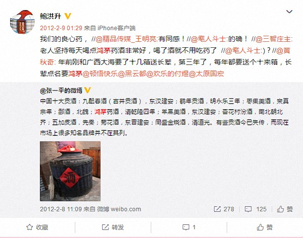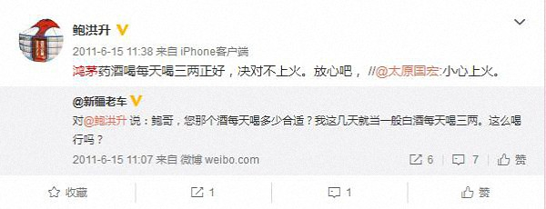 鲍洪升微博截图2:称每天喝鸿茅药酒3两正好