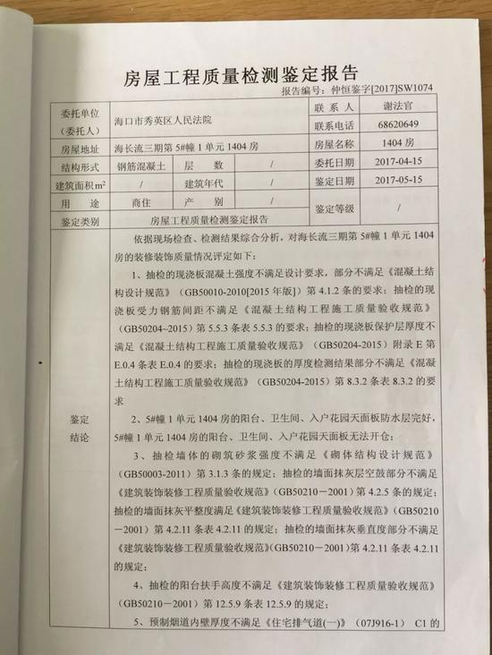 开发商状告6业主“商品房预售合同纠纷”一案立案后,2017年4月15日,秀英区法院也委托相关房屋安全鉴定机构,对符先生所购买的商品房进行鉴定。鉴定报告结论显示:综合所述,海长流三期第5#幢1单元1404房屋存在工程质量问题。