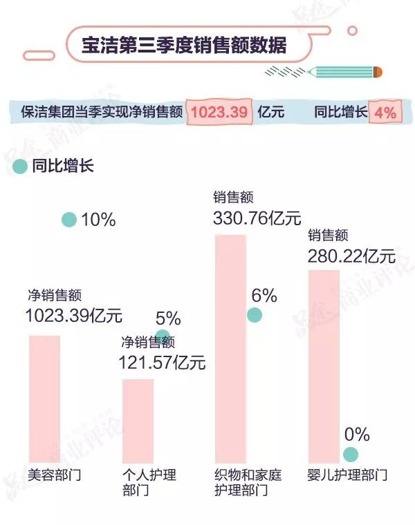 分不同的营业部门来看,美容部门的净销售额达到184.43亿元,同比增长10%,有机销售额增长5%,美容部门也是所有部门中销售额涨幅最高的;个人护理部门净销售额为121.57亿元,同比增长5%,有机销售额增长1%;织物和家庭护理部门第三季度销售额为330.76亿元,同比增长6%,有机销售额增长3%;婴儿护理部门销售额为280.22亿元,与去年同期持平,有机销售额下降3%。