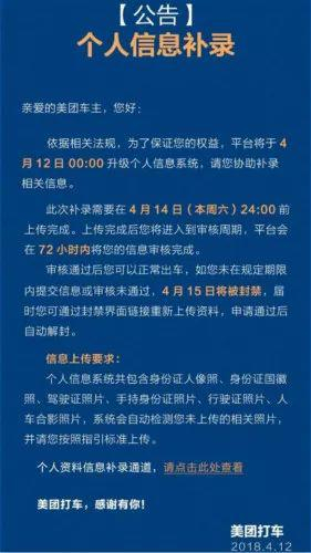 4月12日,上海地区美团打车司机收到了官方公告,要求车主立即补录个人信息。此次补录要求车主在4月12日——4月14日两天内限期完成,如果美团车主不能在规定期限补录或补录审核未通过,4月15日将被封禁,要求严格。