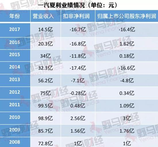 2017年年报显示,一汽夏利实现营业收入14.5亿元,同比下降28.34%;归属上市公司股东的净利润为-16.41亿元,同比降幅达1110.64%。