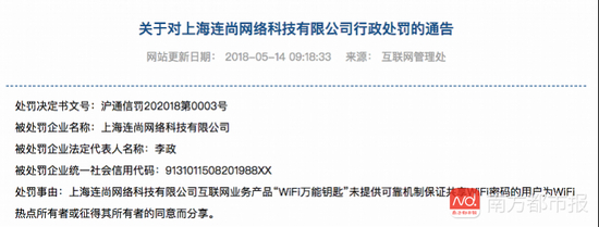 5月14日,上海市通信管理局官网发布了《关于对上海连尚网络科技有限公司行政处罚的通告》。上海连尚网络科技有限公司(以下简称连尚网络)即WiFi万能钥匙所属公司。根据该通告,处罚事由是WiFi万能钥匙未提供可靠机制保证共享WiFi密码的用户为WiFi热点所有者或征得其所有者同意而分享。
