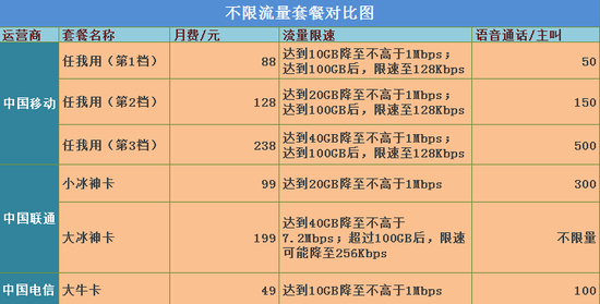 先来看中国移动的“任我用”全国不限量套餐:三档定价为88元、128元以及238元的套餐,分别对应的是10GB、20GB和40GB,超出该数值会被限速;语音通话时常则分别为50分钟、150分钟、500分钟。