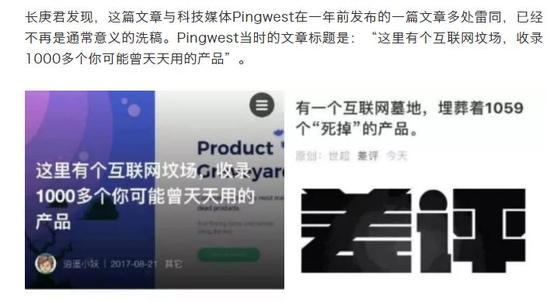 里面白纸黑字的写到:长庚君发现,这篇文章与科技媒体 Pingwest ( 品玩 )在一年前发布的一篇文章多处雷同,已经不再是通常意义的洗稿。Pingwest ( 品玩 )当时的文章标题是:“ 这里有个互联网坟场,收录 1000 多个你可能曾天天用的产品 ”。
