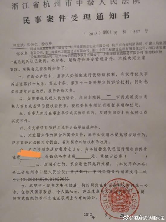 林生斌28日晚在其认证微博中贴出的杭州市中院“民事案件受理通知书”截图显示,该案的原告为林生斌和朱小贞的父母,被告为绿城物业服务集团有限公司、杭州绿城海企实业有限公司、杭州市公安局消防局、中建三局集团有限公司、浙江绿城东方建筑设计有限公司、浙江中兴工程建设监理有限责任公司、浙江诸安建设集团有限公司、杭州华安消防技术服务有限公司、上海洋晨家政服务有限公司。据了解,绿城物业服务集团有限公司为“蓝色钱江公寓”提供物业服务,上海洋晨家政服务有限公司是介绍莫焕晶来林家的中介公司,其余被告包括涉事小区的房地产项目公司,以及负责设计、监理、提供消防设备的机构等。