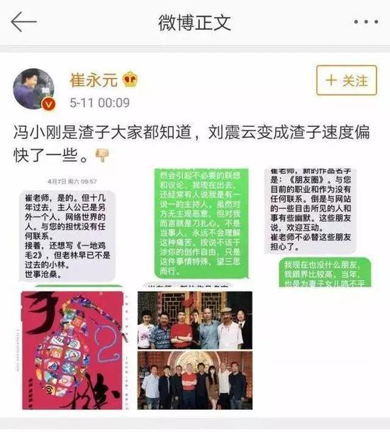 第二天的夜里,崔永元老师就不忍了,直接点名发了一条微博:“冯小刚是渣子大家都知道,刘震云变成渣子的速度偏快了一些。”微博里晒了他和刘震云的往来短信。
