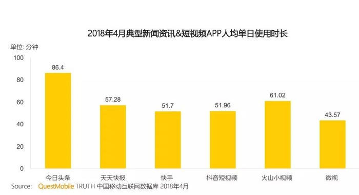 QuestMobile提供的另一数据显示,4月份,今日头条人均单日使用时长为86.4分钟,抖音为51.96分钟,天天快报和微视分别为57.28分钟和43.57分钟。