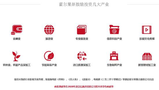 某公司注册及财税服务机构的网站宣传页面,总结了霍尔果斯鼓励投资的几大产业。