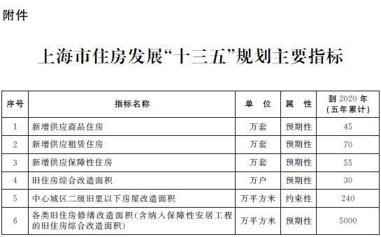“十三五”期间(2016-2020年),上海新增各类住房170万套,要比“十二五”(2011-2015年)期间增加60%左右。为此,住房用地供应预计供应5500公顷,比“十二五”期间增加近20%,平均每年供应超过一千公顷。其中商品住房用地2000公顷,租赁住房用地1700公顷,保障性住房用地1800公顷。