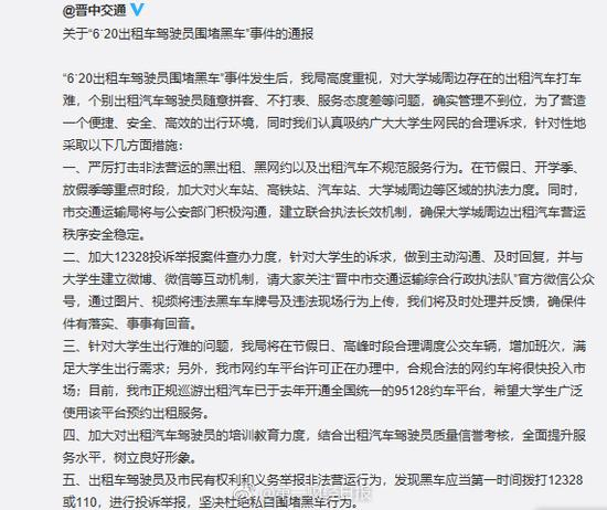 针对学生们吐槽的“出租车坐地起价?南站50元,机场40元,从不打表”、“网约车被围堵不是一半次,网约车根本不敢到大学城接单”等问题,“晋中发布”发文表示高度重视,对大学城周边存在的出租汽车打车难,个别出租汽车驾驶员随意拼客、不打表、服务态度差等问题,确实管理不到位,为了营造一个便捷、安全、高效的出行环境,同时我们认真吸纳广大大学生网民的合理诉求。