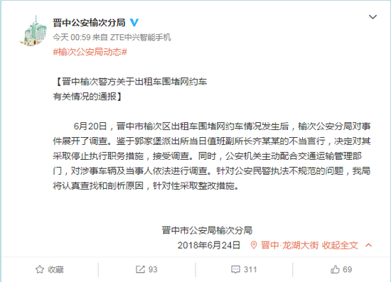 新浪财经讯 6月24日消息, 6月20日,晋中市榆次区出租车围堵滴滴网约车情况。今日(24日),晋中市公安局榆次分局官方微博发布通报,“鉴于郭家堡派出所当日值班副所长齐某某的不当言行,决定对其采取停止执行职务措施,接受调查。同时,公安机关主动配合交通运输管理部门,对涉事车辆及当事人依法进行调查。”