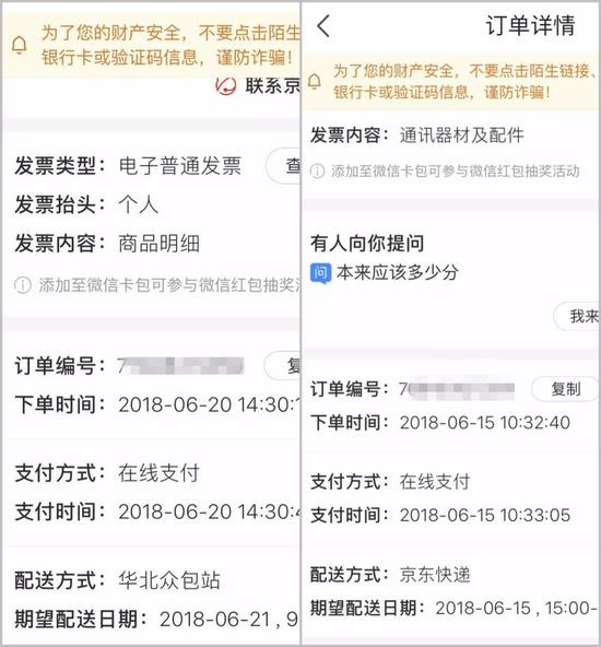 今年618前后,李女士在京东上消费了有十几笔,其中,6月15日她以7399元的价格下单购买了一部iPhoneX手机,6月20日又下单购买了价值141.70元的生鲜商品。