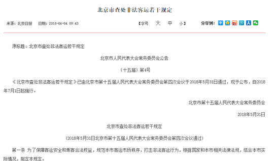 近日,北京市发布的《北京市查处非法客运若干规定》(下称《规定》)正式实行。其中新规定中对于未经许可擅自从事或者组织从事网络预约出租汽车客运经营的,由交通行政执法部门责令停止经营,进行罚款、扣留驾驶证和车辆,并将违法行为主体纳入信用信息系统等处罚。这也被称为史上最严网约车政策。