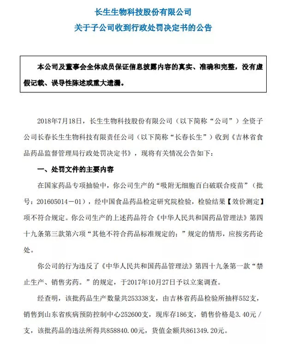 长生生物发布公告称