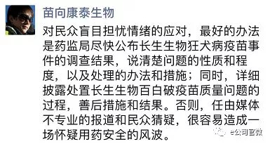 对于民众盲目担忧情绪的应对,最好的办法是药监局尽快公布长生生物狂犬病疫苗事件的调查结果,披露处置该公司的百白破疫苗质量问题的过程,善后措施和结果。