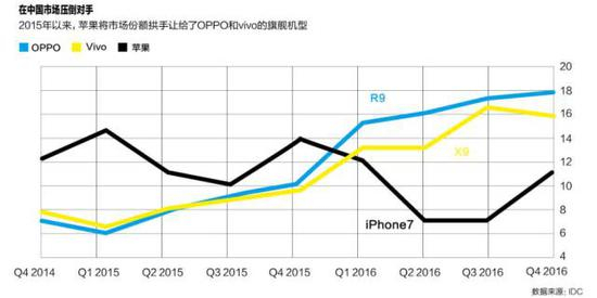 这样的努力取得了回报。据IDC估算,2016年,这对姊妹企业加起来在中国的出货量超过了1.47亿部,相比之下,华为技术有限公司(Huawei Technologies Co.)的出货量仅为7660万部,苹果和小米(Xiaomi)则分别为4490万部和4150万部。相较于2015年,Oppo和Vivo的销量双双倍增。第四季度,它们分别位列第一和第三,华为则排名第二位。IDC分析师谭小涵(Tay Xiaohan,音译)表示,它们的策略在三四线城市的表现尤为亮眼,中档手机在此类城市里已成为主流选择。
