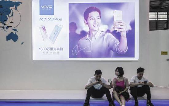 中国上海,出席者们坐在Vivo广告牌前玩手机