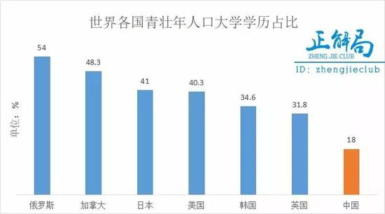 美国大学理事会就各国大学生比例在全球16个国家进行了一次调查评选,结果显示,在25-64岁的青壮年人口中,俄罗斯是54%, 加拿大是48.3%,日本是41%,美国是40.3%。
