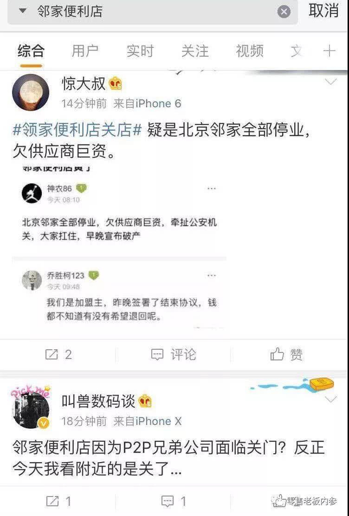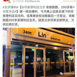 随后我们也发现,邻家便利店的问题远不是关几家店那么简单。紧接着,微博上就有网友相继爆料:“北京邻家全部停业,欠供应商巨资,牵扯公安机关,大家扛住,早晚宣布破产。”在这条消息下面,有网友评论道:“我们是加盟主,昨晚签署了结束协议,钱都不知道有没有希望退回。”