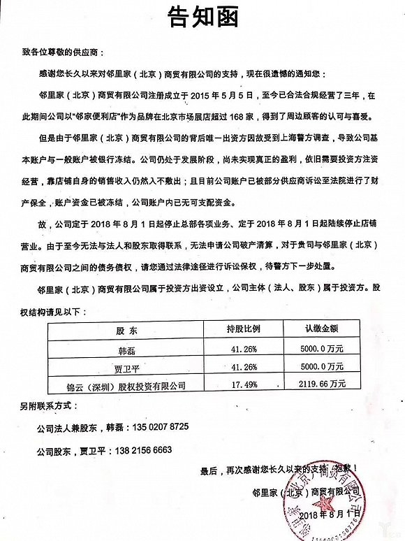 夜里,邻里家(北京)商贸有限公司向供应商发出告知函称,公司将于8月1日起停止总部各项业务,并陆续停止门店营业。由于公司背后唯一出资方受到上海警方调查,导致公司银户账户被冻结。因为公司处于发展阶段,尚未真正实现盈利,依旧需要投资方注资经营,靠店铺自身销售收入仍然入不敷出,且目前公司账户已被部分供应商诉讼至法院进行了财产保全,账户资金已被冻结,公司账户内已无可支配资金。