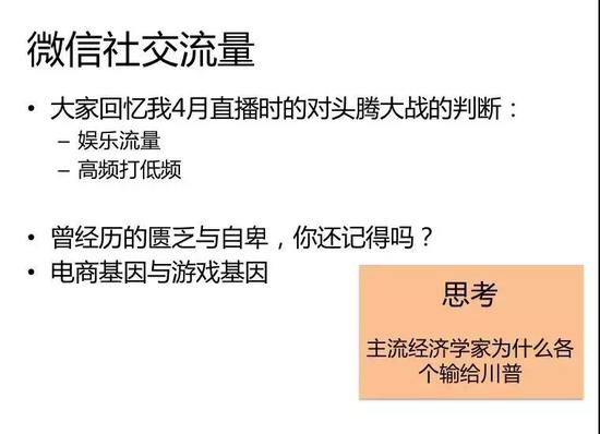 最早大家做QQ,大家在QQ上真的是跟熟人很有效率沟通吗?那是MSN,QQ上大家都是陌生人,微信是就是不断地打破圈层壁,连接不一样的世界。所以腾讯的流量给所有小闲用户,也就是娱乐用户导流效率都是非常高的。比如说给视频、游戏,所以其实腾讯从收入本质上是一个游戏公司。