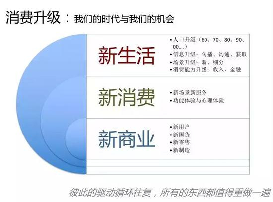 我们现在是在一个消费升级的时代。在消费升级的时代,实际上是新生活、新消费和新商业三件事情循环滚动,在底下不停地迭代。在这样的循环里,所有的东西都值得重做一遍。