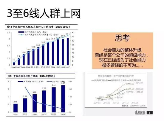 ① 可能对于一线城市的人来讲,拼多多是消费降级,但是对于三到六线人来讲,实际上大家用拼多多是消费升级。