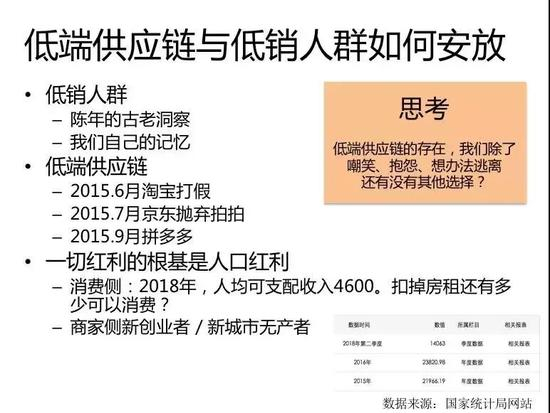 本质上是他背后的价值网,是刚才我说的几大红利,第一无处安放的低端供应链和低消人群,大家的需求无法满足。那些低端供应链的人就该死吗?这些低消人群买得起高端的东西吗?这是第一,他们如何安放的东西。接着其他的这些事情。
