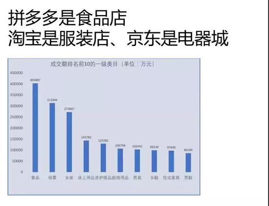 在拼多多排名前十的类目中,排到第一的类目是食品。而淘宝排第一的是服装,具体而言是女装。京东是怎么开始的?京东是卖3C产品,接着扩展到家电,现在又扩展到很多。