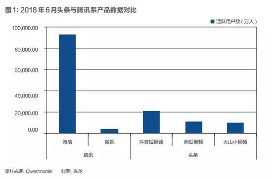 2018年春节期间,头条势头达到高峰——抖音日活破亿,刚结束300亿美 元估值融资的头条,将2018年广告收入目标定为300-500亿元人民币,2018年8月7日,据《华尔街日报》报道,头条此轮将以750亿美元的估值融资30亿美元。一年间,其估值几乎翻倍,增长速度超过了美团、滴滴。据头条一位核心员工称,头条的目标是千亿美元市值上市。但2017年底也是腾讯的鼎盛时刻——股价一年内翻番,年底破474港元创新高,成为中国市值最高的公司,2018财年也取得历史最 高收入2377.6亿元。