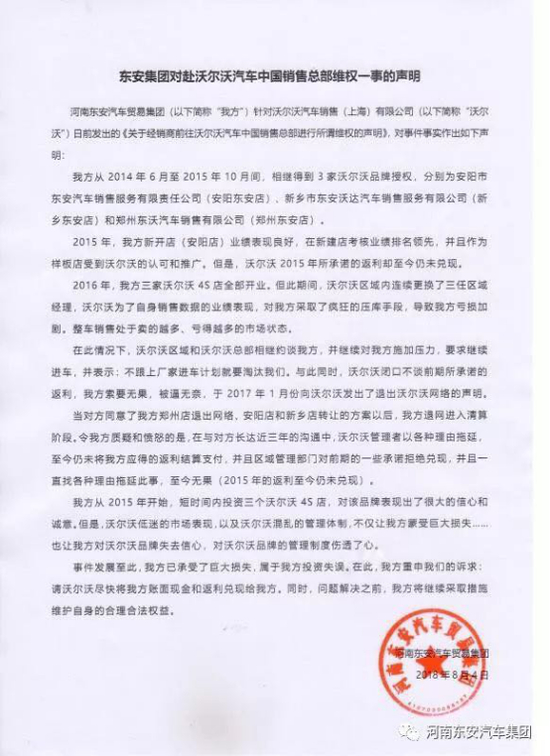 沃尔沃经销商退网问题主要集中在河南地区,沃尔沃在声明中称,沃尔沃汽车从2014年6月至2015年10月间,与东安集团旗下3家经销商签署经销商协议,分别为安阳市东安汽车销售服务有限责任公司(安阳东安店)、新乡市东安沃达汽车销售服务有限公司(新乡东安店)和郑州东沃汽车销售有限公司(郑州东安店)。